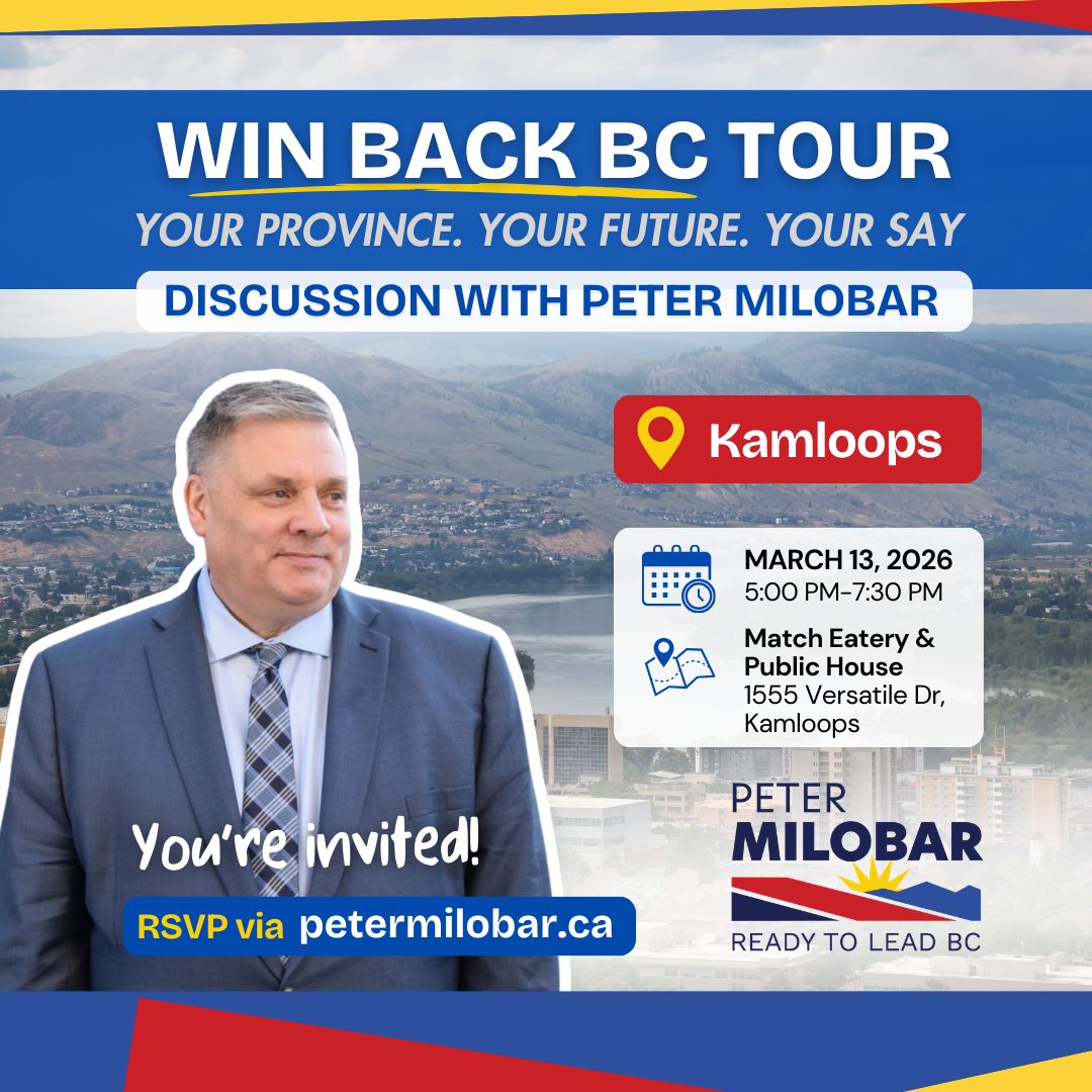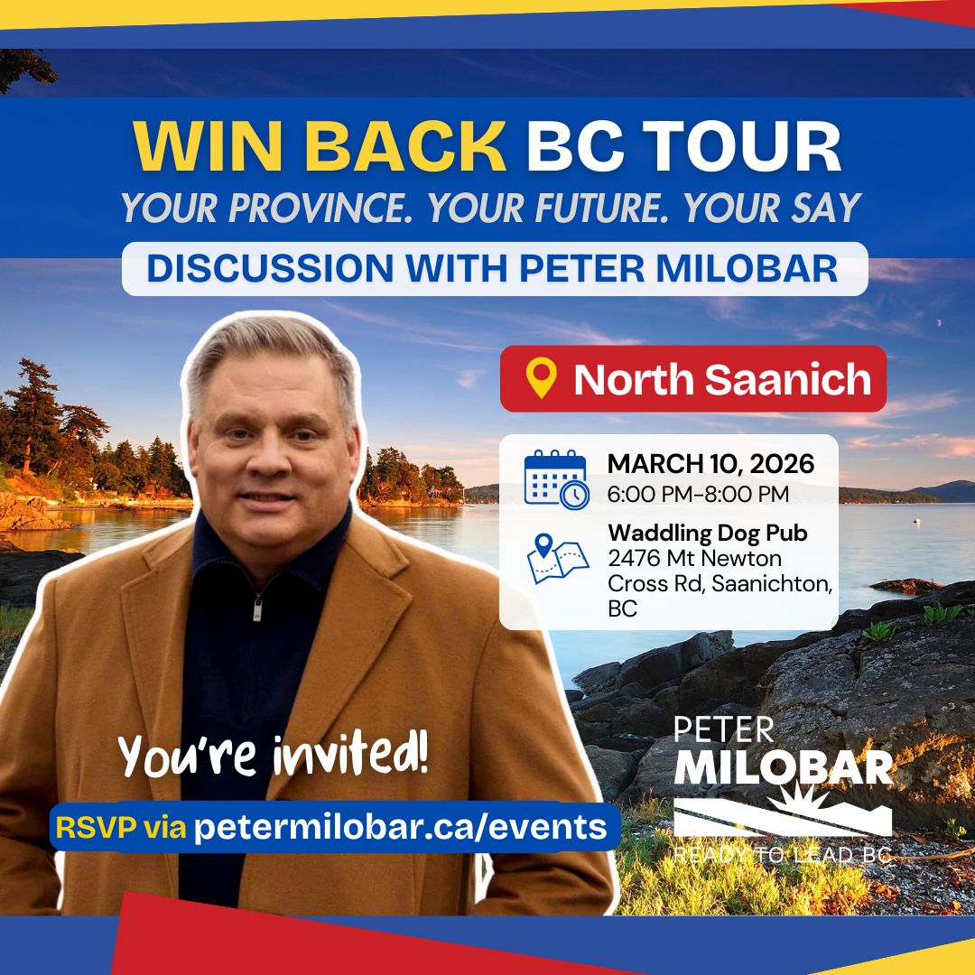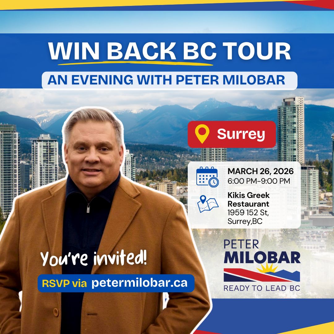 Peter Milobar, MLA and Finance Critic, is coming to a town near you with a message of hope, patriotism, and a desire to hear from you personally. He wants to listen to your ideas on how we can WIN BACK BC.